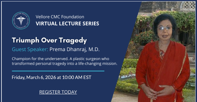 Dear CMC Friends, In recognition of and to celebrate Women’s History Month and International Women’s Day 2026, the Vellore Christian Medical College Foundation is excited to announce the scheduling of its first Virtual Lecture Series event of the year entitled “Triumph over Tragedy”! On Friday, March 6th at 10 am EST, Prema Dhanraj, M.D., the former Head of the Department of Plastic and Reconstructive Surgery at Christian Medical College, Vellore (CMC) and recipient of the 2024 Padma Shree Award will share the story of her personal journey from childhood tragedy into an extraordinary adult life. “Give to Gain” is the theme of this year’s Women’s History Month, which presents an opportunity to recognize and honor women’s contributions to fostering a mindset of generosity and collaboration. Dr. Dhanraj’s story is one of Divine intervention, associated with a mother’s fervent prayers. The outcome was holistic healing accomplished through high-quality, compassionate care at CMC Vellore, a patient treatment experience that saved Prema’s life and where she later served on their medical staff in the Department of Plastic and Reconstructive Surgery! After her training in medicine, Dr. Dhanraj acquired special fellowships in the United States and UK. During her 30 years of service at CMC, Dr. Dhanraj started MCh – the post graduate medical degree training program focused on advanced surgical skills and research, along with designing a Burn Unit. Like our Dr. Ida Sophia Scudder, founder of CMC, Prema persisted in her mission! “Agni Raksha” founded by Dr. Dhanraj provides integrated rehabilitation for burn survivors, especially empowering women and children from marginalized communities. Dr. Prema Dhanraj’s remarkable contributions were recognized by the Plastic Surgery Education Foundation, making her the first Indian to receive such an award. We welcome you to join us! To participate in this virtual event, please register below. What: “Triumph Over Tragedy”, a live webinar by Prema Dhanraj, M.D., hosted by the Vellore CMC Foundation When: Friday, March 6th at 10:00 AM EST | 8:30 PM IST Register: Click the link below to register and receive detailed instructions for joining the event. |